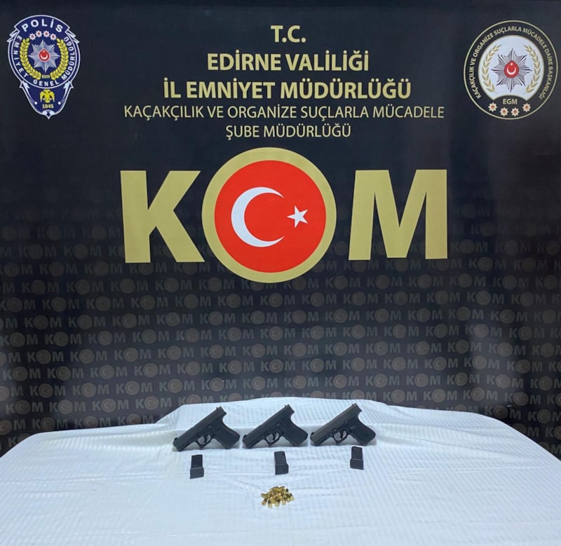 Edirne'de polis ekiplerinin şüpheyle durdurduğu otomobilde suikast silahı olarak bilinen, seri numaraları kazınmış 3 tabanca ele geçirilirken 1 kişi tutuklandı.