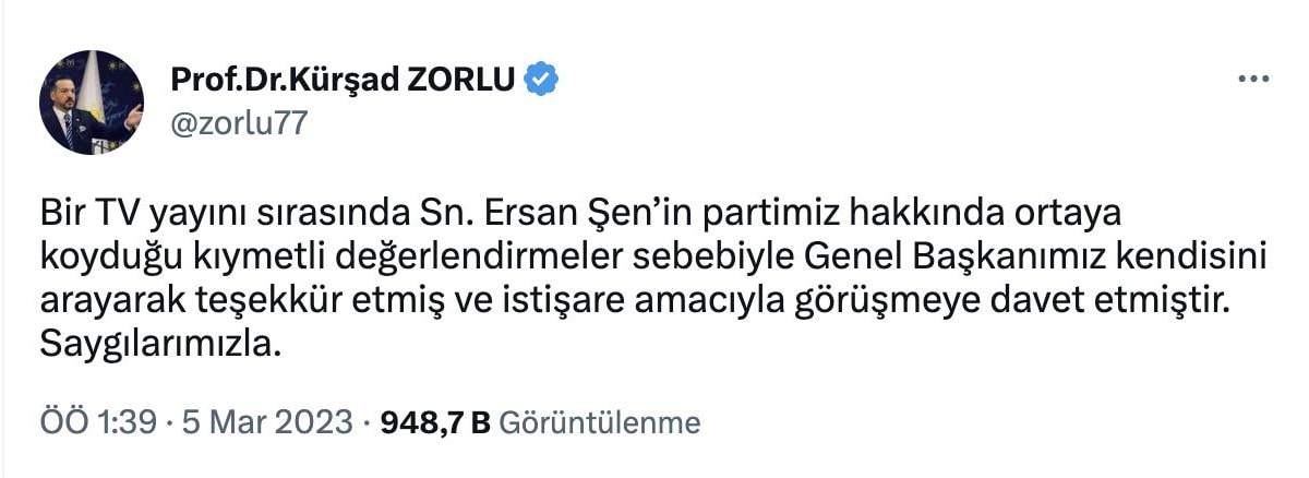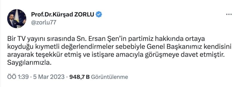 Bir TV yayını sırasında Sn. Ersan Şen’in partimiz hakkında ortaya koyduğu kıymetli değerlendirmeler sebebiyle Genel Başkanımız kendisini arayarak teşekkür etmiş ve istişare amacıyla görüşmeye davet etmiştir. Saygılarımızla.