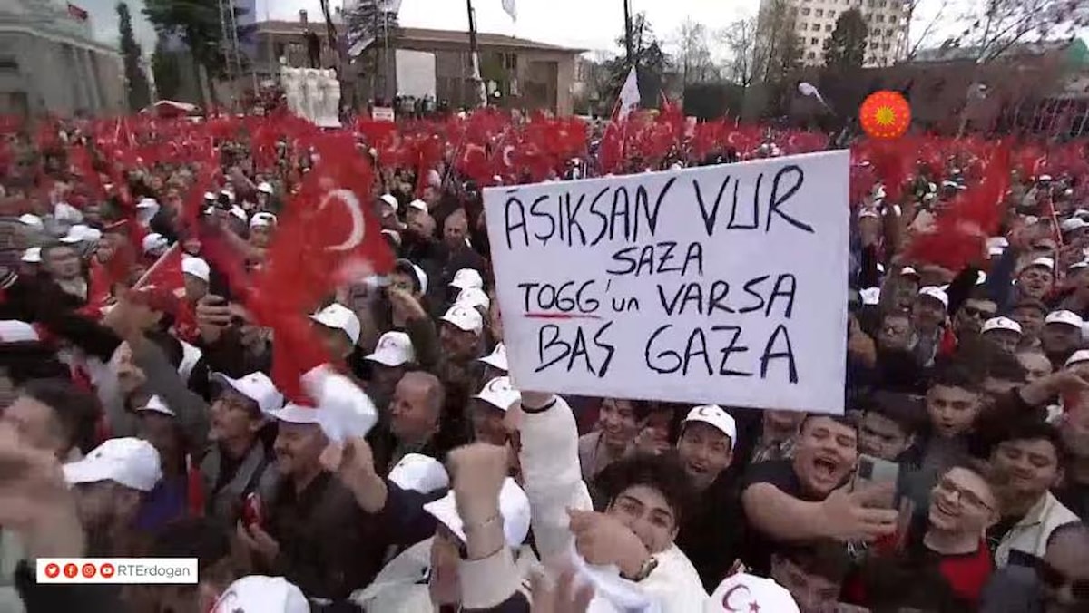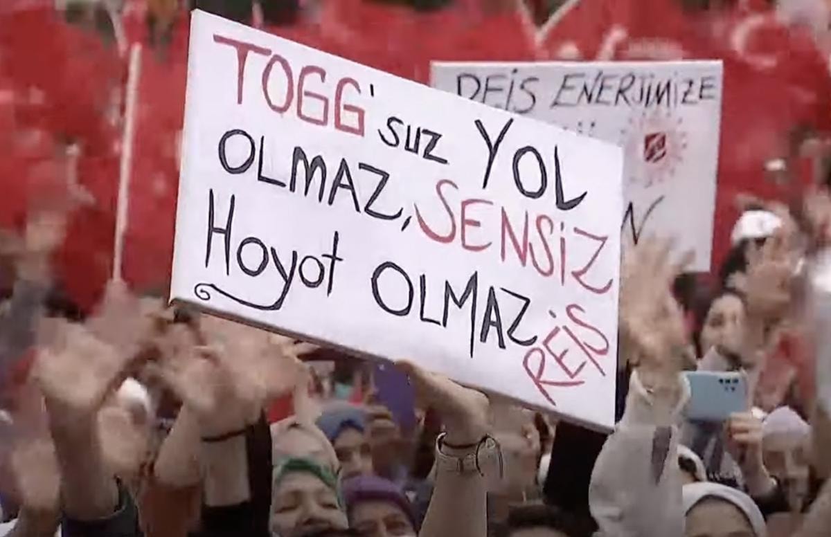 Türkiye'nin yarım asırlık hayali olan yerli otomobil Togg'a gönderme yapılan o pankartta, "Togg'suz yol olmaz, sensiz hayat olmaz Reis" yazdığı görüldü.