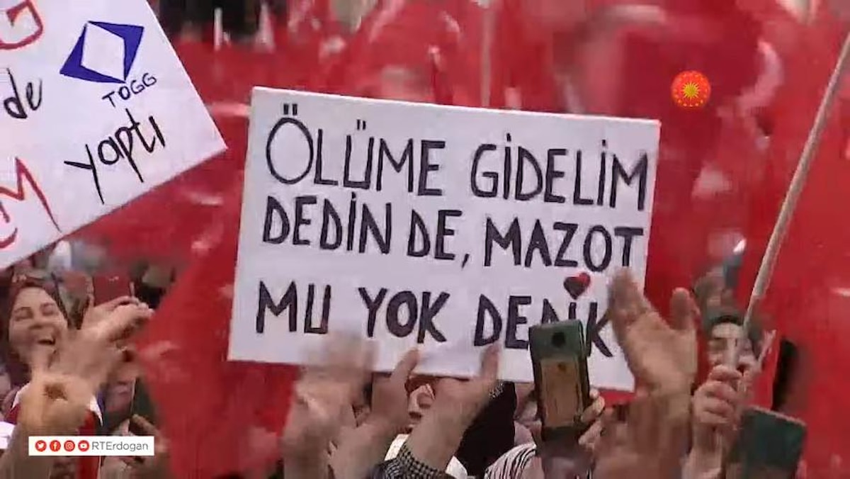 Partililerin çoğu ise alana hazırladıkaları pankartlarla geldi. Biraz mizah biraz da mesaj içerikli pankartlar Erdoğan'ın da gözünden kaçmadı.