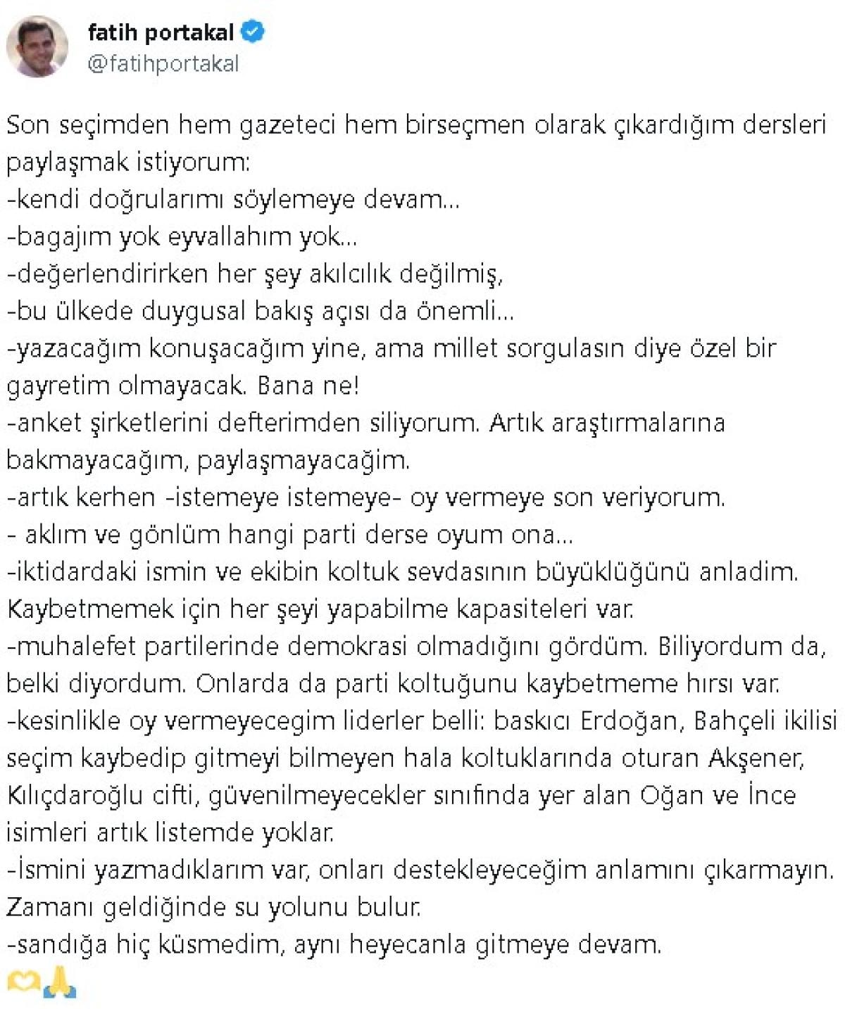Portakal, sosyal medya hesabından yaptığı son paylaşımında şu ifadelere yer verdi: