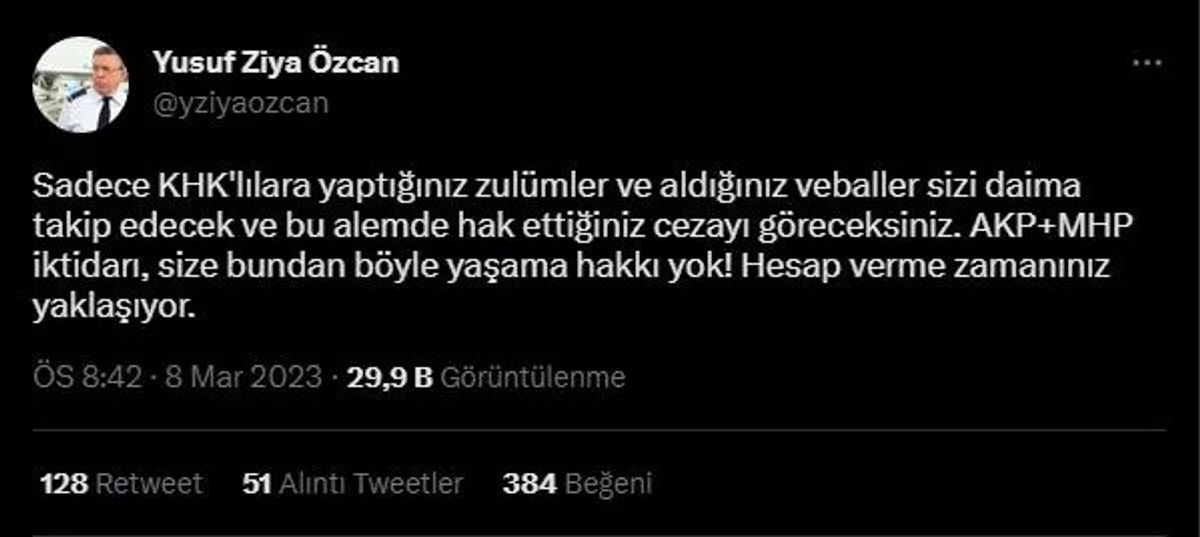 Özcan, Twitter hesabından yaptığı paylaşımda KHK'lılar üzerinden AK Parti ve MHP'yi hedef aldı.