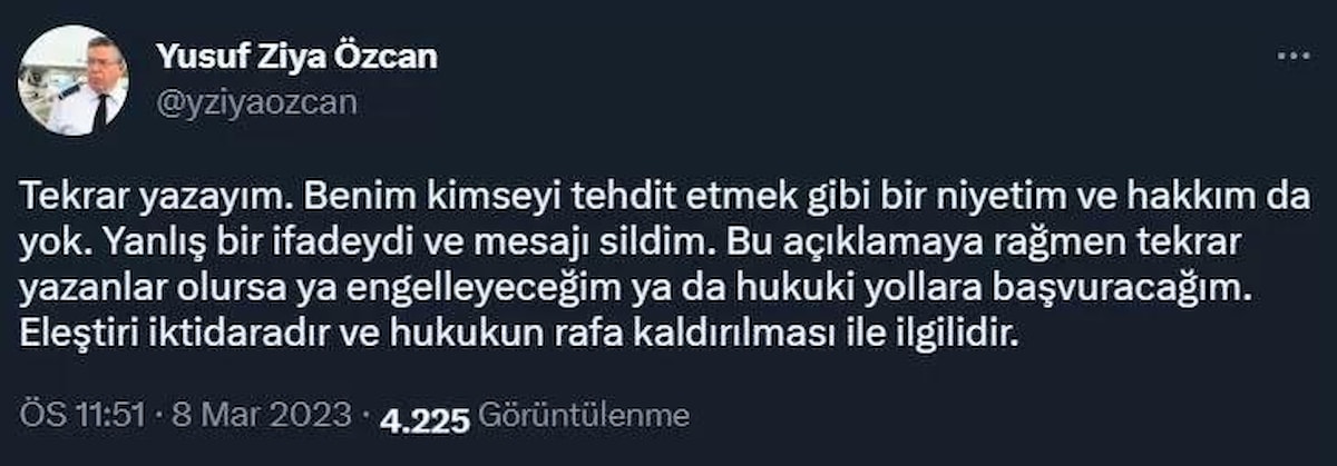Yoğun tepki üzerine paylaşımını silen Özcan, yine sosyal medya hesabından bir açıklama yaptı.