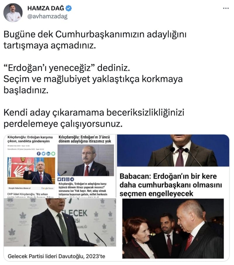 AK Parti Genel Başkan Yardımcısı Hamza Dağ, 6’lı masanın “Erdoğan'ın aday olması mümkün değildir.” açıklamasına ilişkin sosyal medyada paylaşımda bulundu.