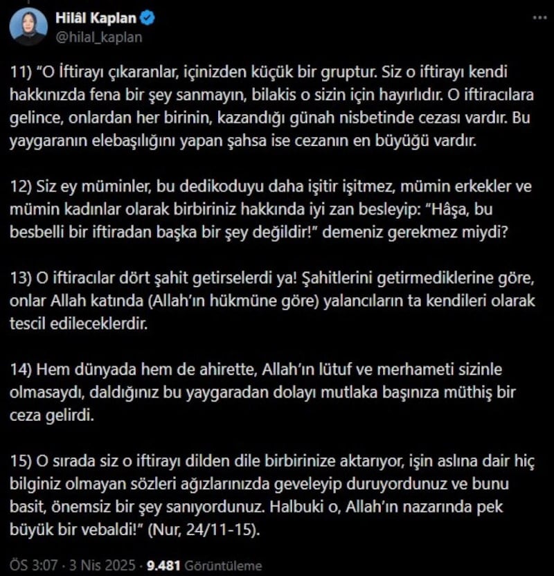 HİLAL KAPLAN'DAN AYETLİ PAYLAŞIM