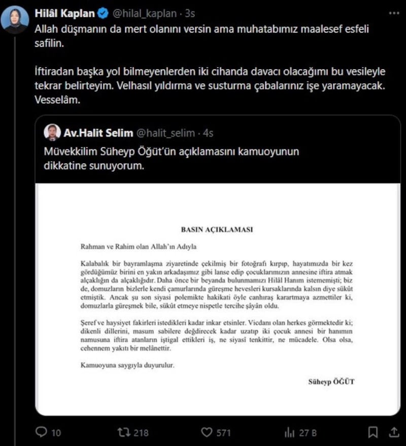 Sosyal medya hesabından paylaşımda bulunan Kaplan, Avukat Halim Selim'in paylaşımına dikkat çekti.