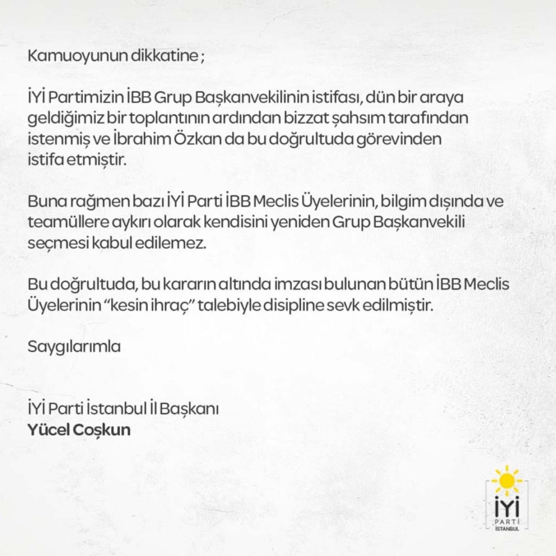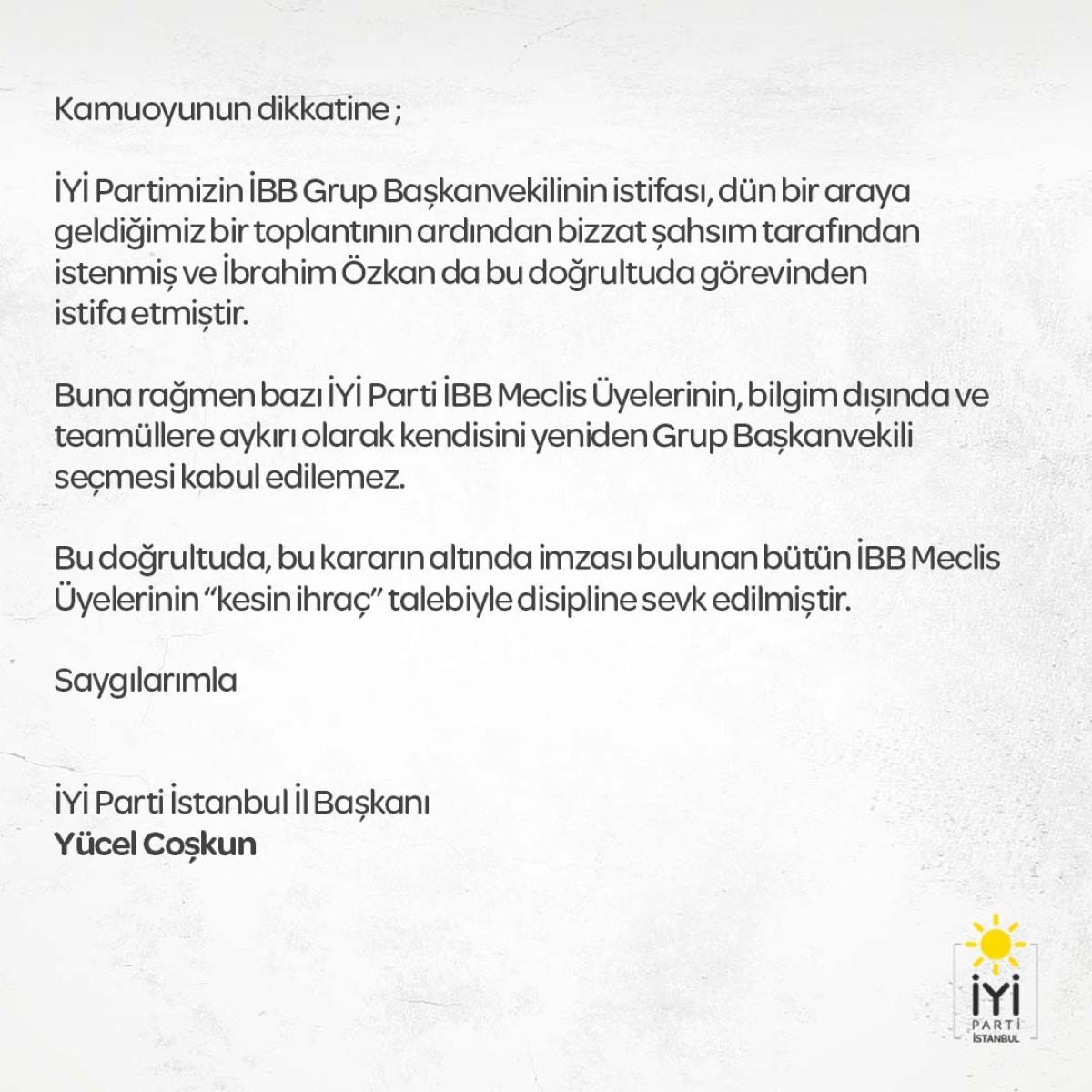 Yaşanan bu gelişmelerin ardından, İYİ Parti İstanbul İl Başkanı Yüksel Coşkun, İBB Grup Başkanvekili İbrahim Özkan'ın istifası sonrasında kendisinin bazı üyelerce yeniden Başkanvekili olarak seçilmesinin kabul edilemez olduğunu ve bu karar altında imzası olanların "kesin ihraç" talebiyle disipline sevk edildiğini bildirdi.