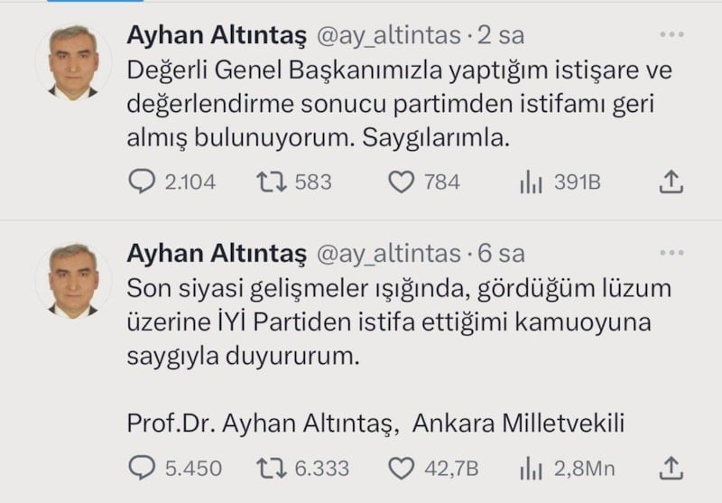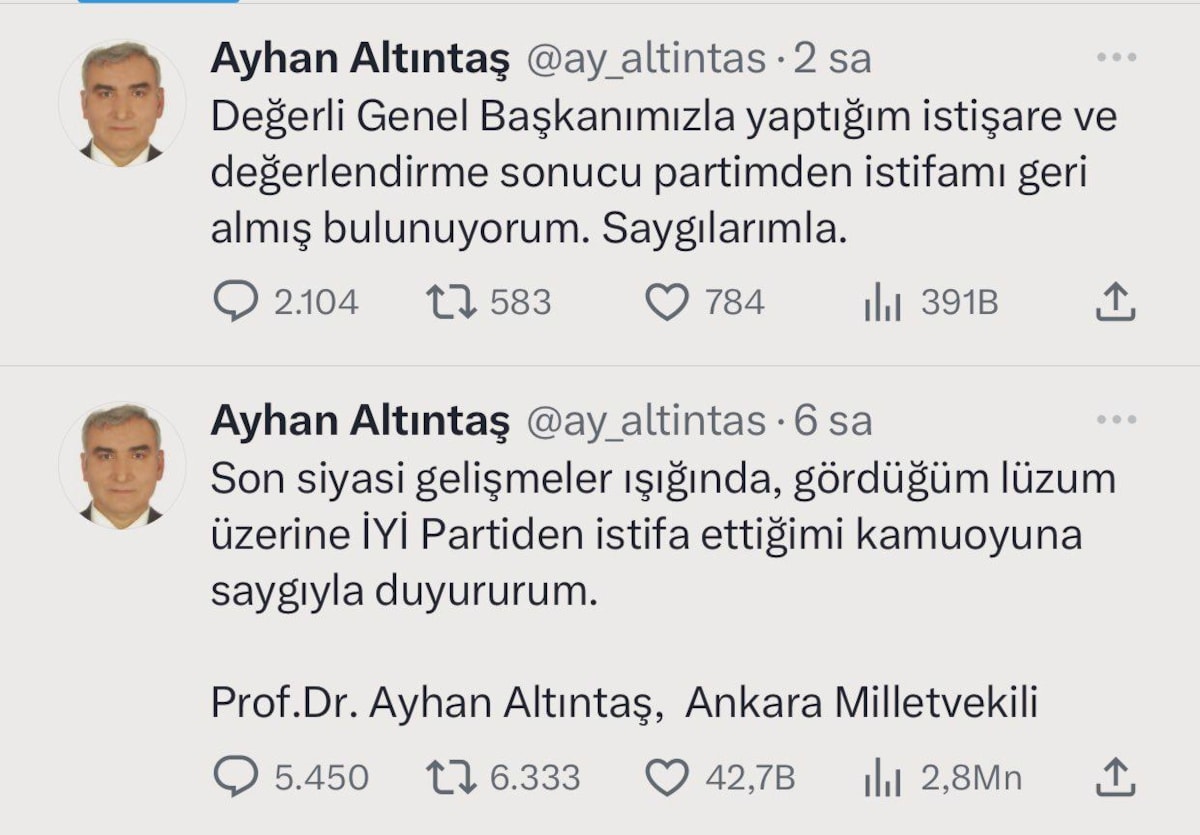 İYİ Parti Ankara Milletvekili Ayhan Altıntaş, sosyal medya hesabı üzerinden yaptığı açıklamada, "Son siyasi gelişmeler ışığında, gördüğüm lüzum üzerine İYİ Parti'den istifa ettiğimi kamuoyuna saygıyla duyururum." ifadelerini kullandı.