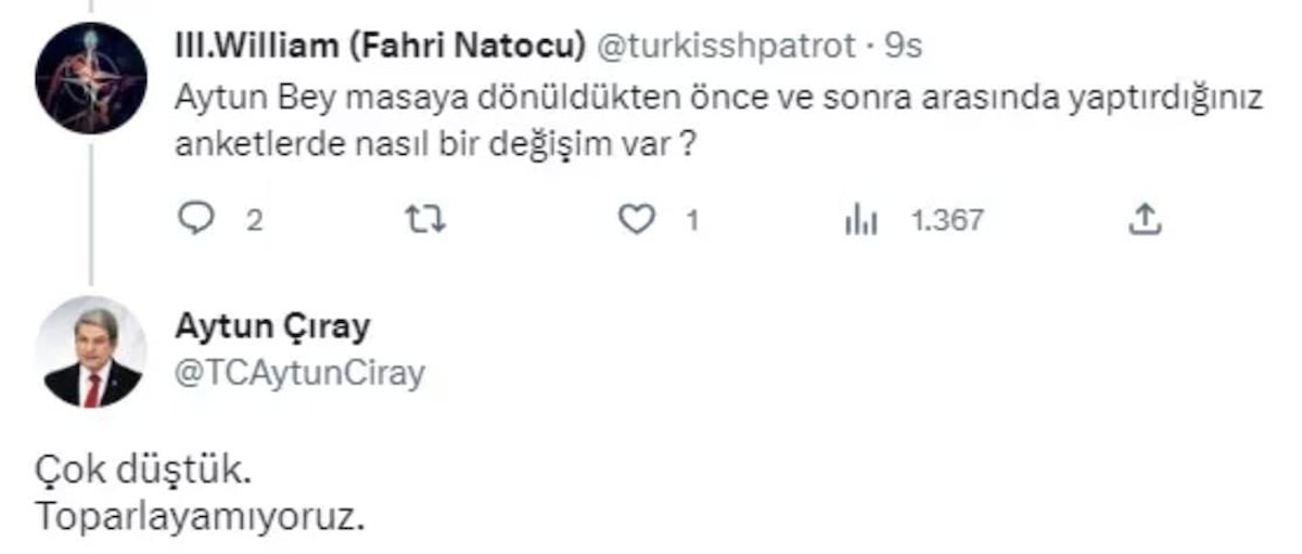 Aytun Çıray, sosyal medyada kendisine yöneltilen, "Aytun Bey masaya dönüldükten önce ve sonra arasında yaptırdığınız anketlerde nasıl bir değişim var?" sorusuna, "Çok düştük toparlayamıyoruz" ifadelerini kullandı.