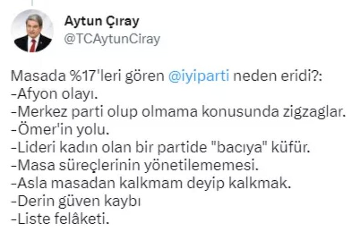 Çıray, daha önce anketlerde yüzde 17'leri gören İYİ Parti'nin oylarınının neden eridiğini de 8 maddede sıraladı.