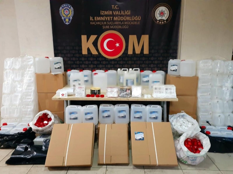 İzmir Emniyet Müdürlüğü'ne bağlı Kaçakçılık Şube Müdürlüğü ekipleri, sağlıksız koşullarda üretilip depolanan ve içki yapımında kullanılması için 'el dezenfektanı' adı altında satışa sunulan, sahte etil alkol üretildiği bilgisi üzerine harekete geçti.