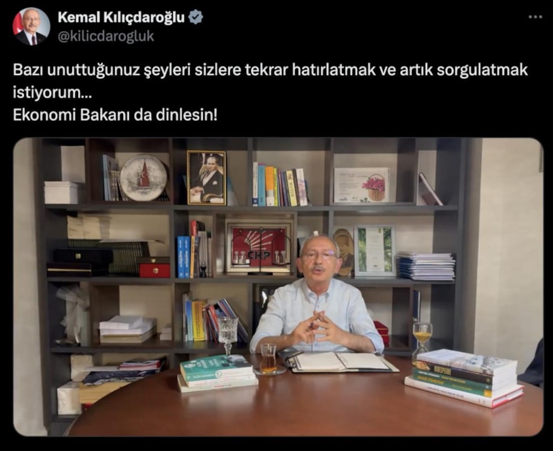 Son paylaşımında ekonomi gündemine ilişkin değerlendirmelerde bulunan Kılıçdaroğlu, videoya "Bazı unuttuğunuz şeyleri sizlere tekrar hatırlatmak ve artık sorgulatmak istiyorum… Ekonomi Bakanı'da dinlesin!" notunu iliştirdi.