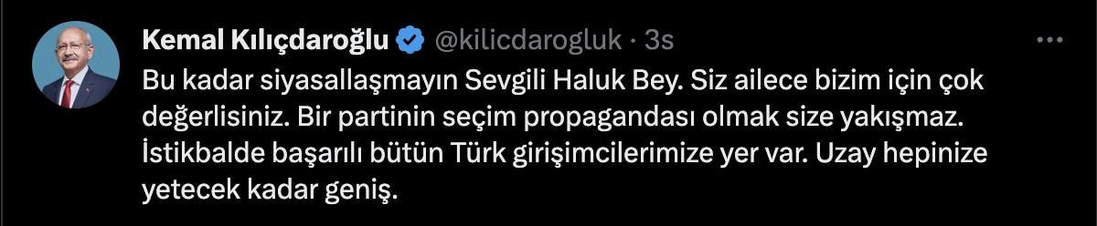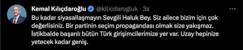 Haluk Bayraktar'ın açıklamalarına Twitter'dan yanıt veren Kemal Kılıçdaroğlu, "Bu kadar siyasallaşmayın Sevgili Haluk Bey. Siz ailece bizim için çok değerlisiniz. Bir partinin seçim propagandası olmak size yakışmaz. İstikbalde başarılı bütün Türk girişimcilerimize yer var. Uzay hepinize yetecek kadar geniş" ifadelerini kullandı.
