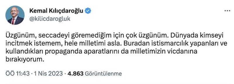 Üzgünüm, seccadeyi göremediğim için çok üzgünüm. Dünyada kimseyi incitmek istemem, hele milletimi asla. Buradan istismarcılık yapanları ve kullandıkları propaganda aparatlarını da milletimizin vicdanına bırakıyorum.