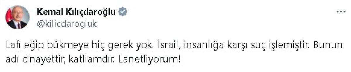 Dünyada vicdanı olanlar sesini yükseltirken, en yüksek ses Türkiye'den yükseliyor. Cumhurbaşkanı Recep Tayyip Erdoğan'ın ardından, CHP Genel Başkanı Kemal Kılıçdaroğlu da saldırıyı kınayan bir açıklama yaptı: