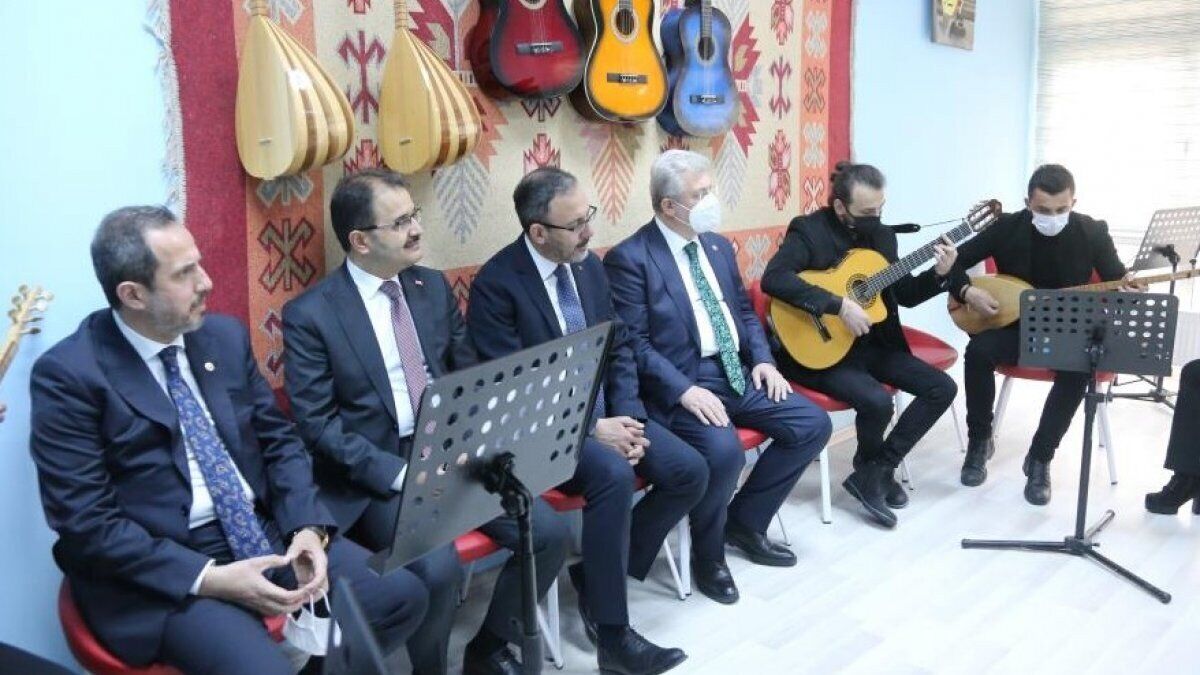 Merkezde bulunan atölyeleri de ziyaret eden Bakan Kasapoğlu, öğrencilerle birlikte “Gönül Dağı” şarkısını söyledi.