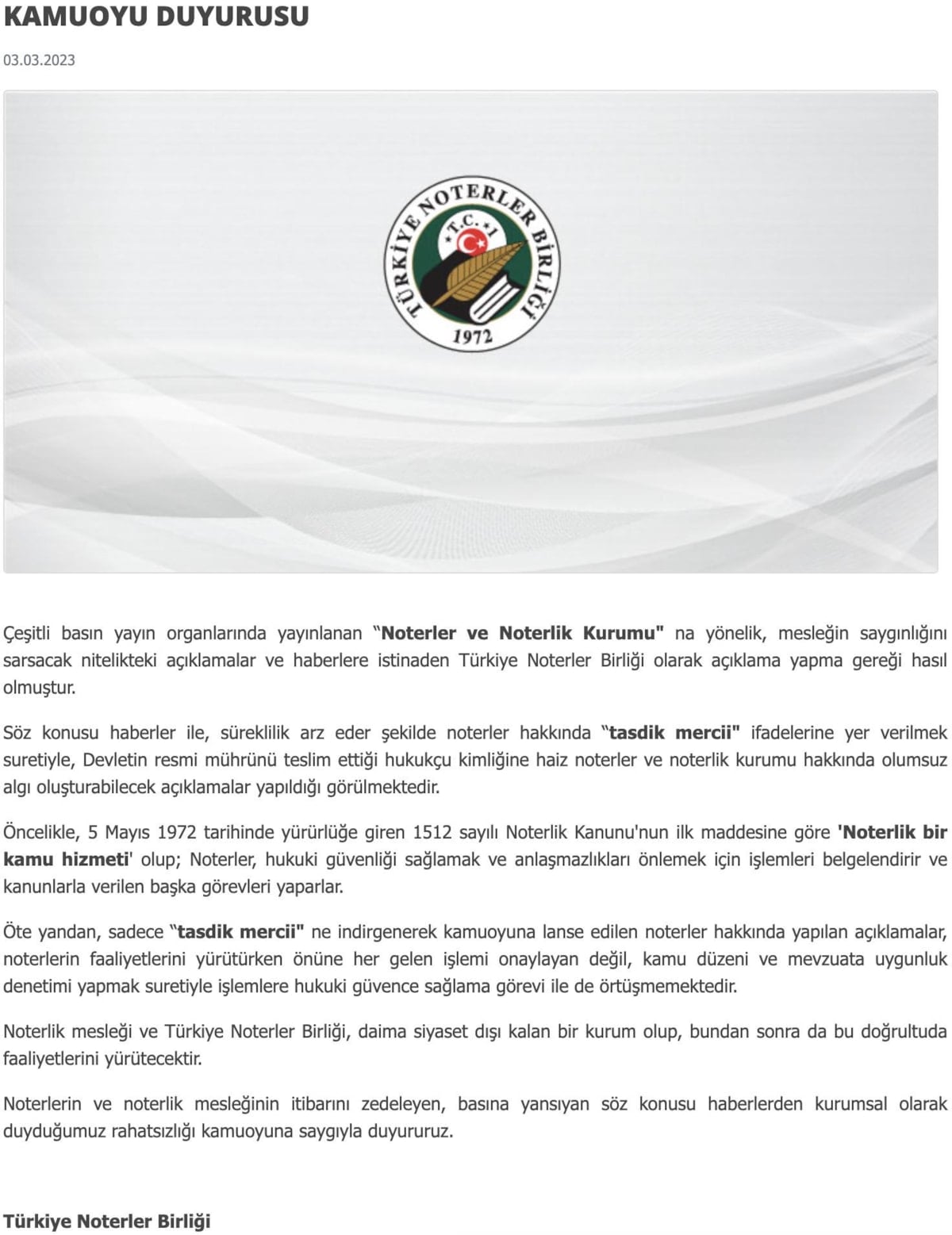 Söz konusu haberler ile süreklilik arz eder şekilde noterler hakkında 'tasdik mercisi' ifadelerine yer verilerek devletin resmi mührünü teslim ettiği hukukçu kimliğini haiz noterler ve noterlik kurumu hakkında olumsuz algı oluşturabilecek açıklamalar yapıldığı vurgulanan açıklamada, 1512 sayılı Noterlik Kanunu'nun ilk maddesine göre noterliğin bir kamu hizmeti olduğu aktarıldı.