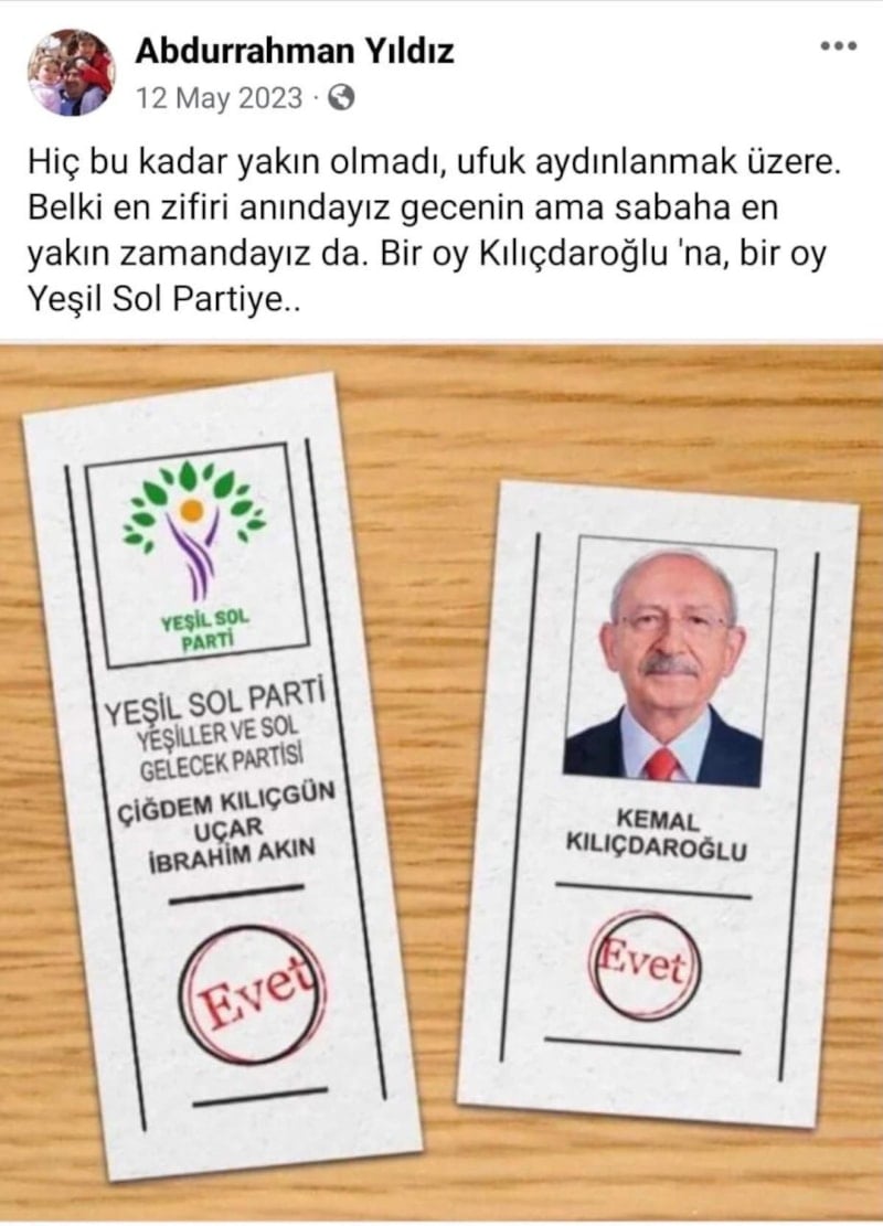 Genel seçimlerde HDP için oy isteyen, yerel seçimlerde ise CHP-DEM Parti ortak adayı olan Mersin'in Toroslar ilçe adayı Abdurrahman Yıldız'ın eski paylaşımları gündem olurken iki parti, ortak halk buluşması düzenledi.