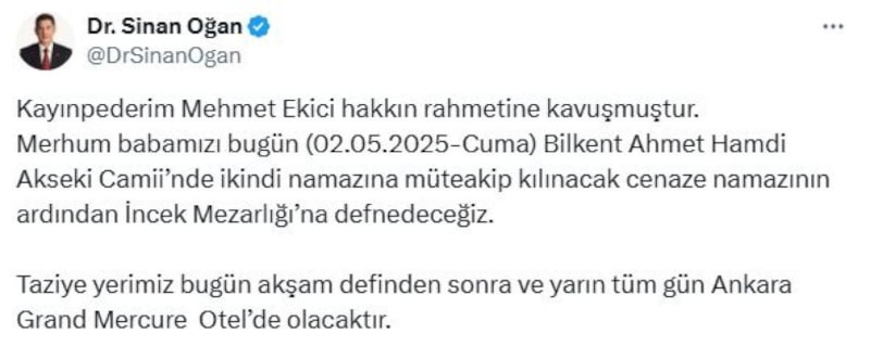 Ekici’nin vefat haberini, kamuoyuyla eski Cumhurbaşkanı adayı Sinan Oğan, sosyal medya üzerinden paylaştı.