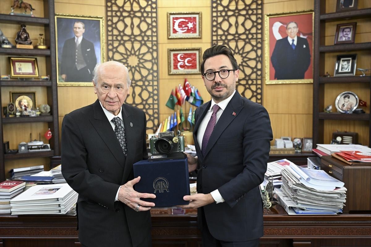 Makamında kabul ettiği AA Genel Müdürü ve Yönetim Kurulu Başkanı Serdar Karagöz, Bahçeli'ye tamamı geri dönüşüm malzemelerinden yapılmış fotoğraf makinesi ile 'Kanıt' kitabını hediye etti.