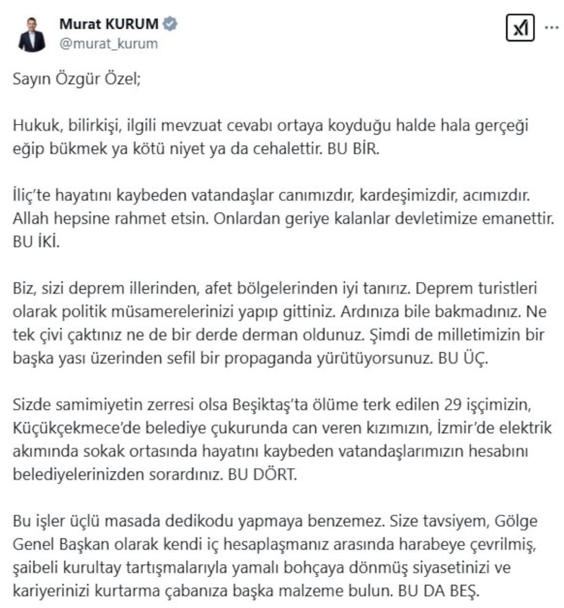 Çevre, Şehircilik ve İklim Değişikliği Bakanı Murat Kurum, CHP Genel Başkanı Özgür Özel'in İliç’teki maden faciasıyla ilgili ithamlarına sosyal medya hesabından tepki gösterdi.