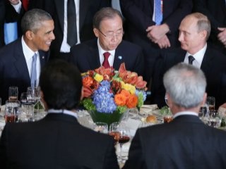 İki yıldır resmi formatta görüşme gerçekleştirmeyip sadece uluslararası zirve ve forumlar çerçevesinde ‘ayaküstü' buluşan Putin ve Obama, bu yıl hiçbir araya gelmemişti. Obama ve Putin yemekte kadeh tokuşturarak tarihi bir kare verdi.