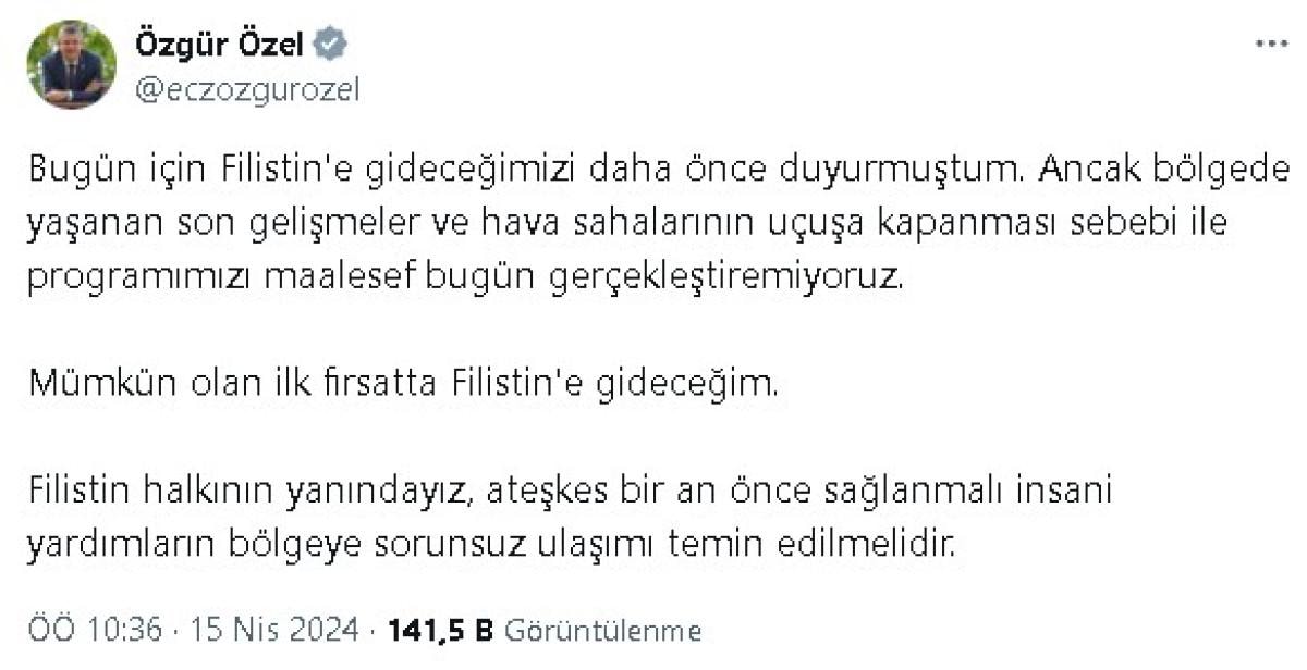 Daha önceden bugün için planlanan Filistin ziyaretini bölgede yaşanan gelişmeler ve hava sahasının uçuşa kapanması nedeniyle gerçekleştiremediğini belirten CHP Genel Başkanı Özgür Özel, sosyal medya hesabından yaptığı açıklamada, şu ifadelere yer verdi: