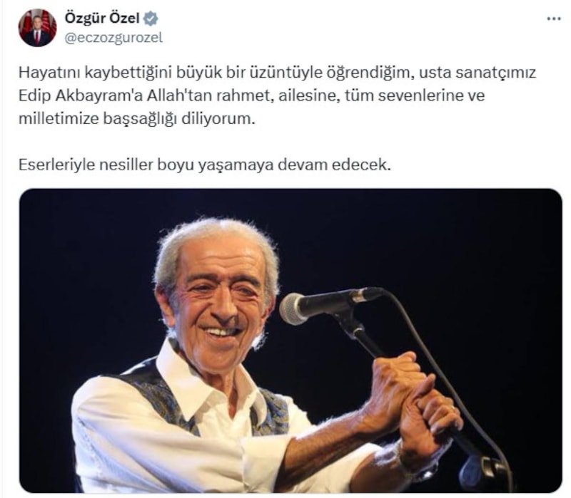 CHP Genel Başkanı Özgür Özel, sosyal medya hesabından usta sanatçı Edip Akbayram'ın hayatını kaybetmesiyle ilgili taziye mesajı yayınladı..