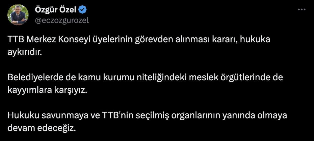 Özel, sosyal medya hesabından yaptığı paylaşımda, "TTB Merkez Konseyi üyelerinin görevden alınması kararı hukuka aykırıdır. Belediyelerde de kamu kurumu niteliğindeki meslek örgütlerinde de kayyımlara karşıyız. Hukuku savunmaya ve TTB'nin seçilmiş organlarının yanında olmaya devam edeceğiz" ifadelerini kullandı.