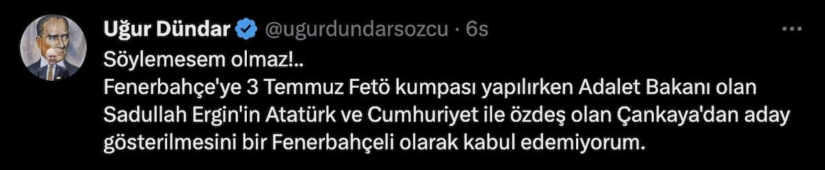 Aynı zamanda Fenerbahçe Yüksek Divan Kurulu Başkanlığı görevini yürüten gazeteci Uğur Dündar, konuyla ilgili sosyal medya hesabından Sadullah Ergin'in CHP'den aday olmasına destek vermediğini şu ifadelerle belirtti: