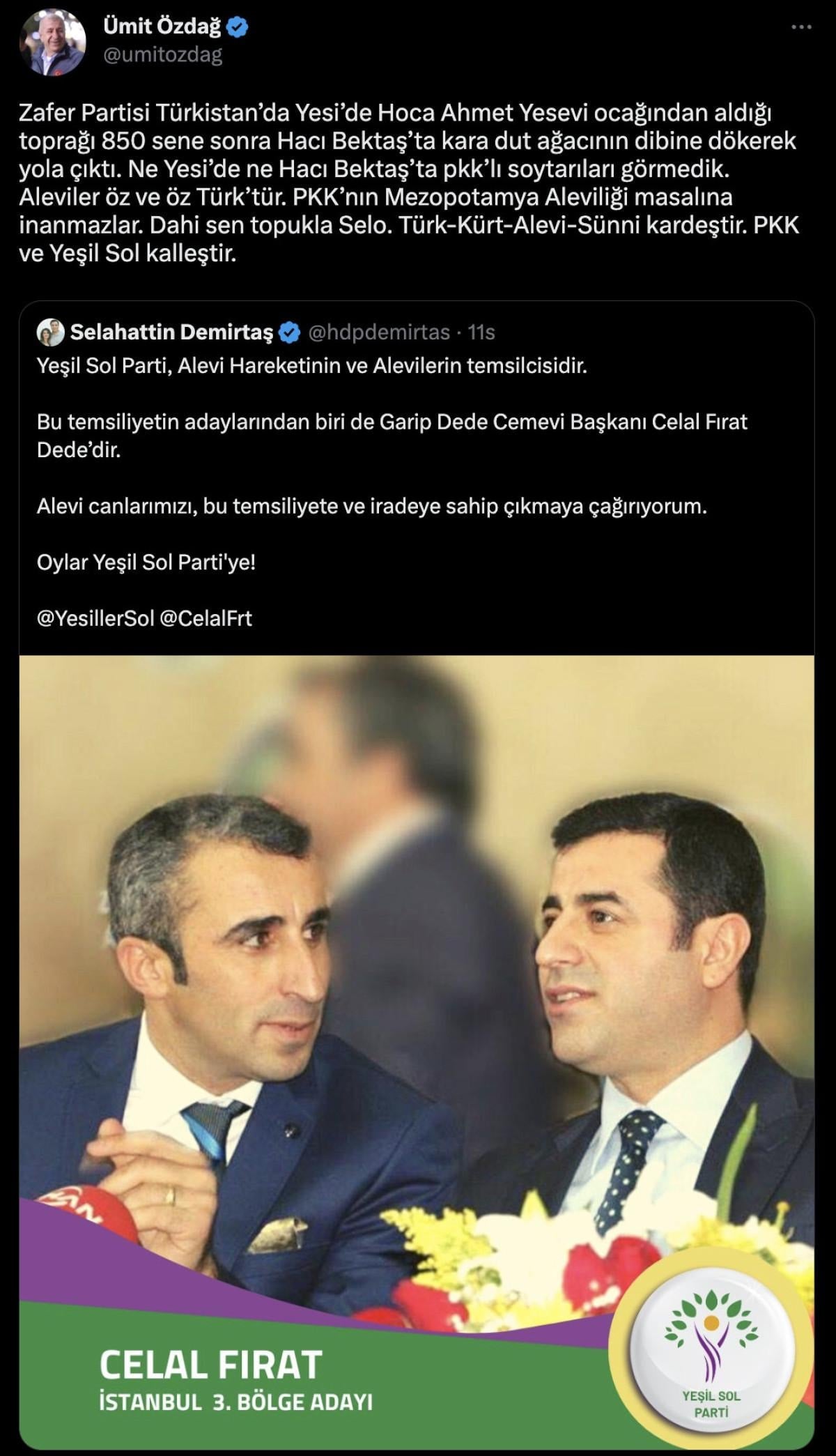 Özdağ, Demirtaş'ın paylaşımını alıntılayarak, "Zafer Partisi; Türkistan'da, Yesi'de, Hoca Ahmet Yesevi ocağından aldığı toprağı 850 sene sonra Hacı Bektaş'ta kara dut ağacının dibine dökerek yola çıktı. Ne Yesi'de ne Hacı Bektaş'ta PKK'lı soytarıları görmedik. Aleviler öz ve öz Türk'tür. PKK'nın Mezopotamya Aleviliği masalına inanmazlar. Dahi sen topukla Selo. Türk-Kürt-Alevi-Sünni kardeştir. PKK ve Yeşil Sol kalleştir." notunu düştü.