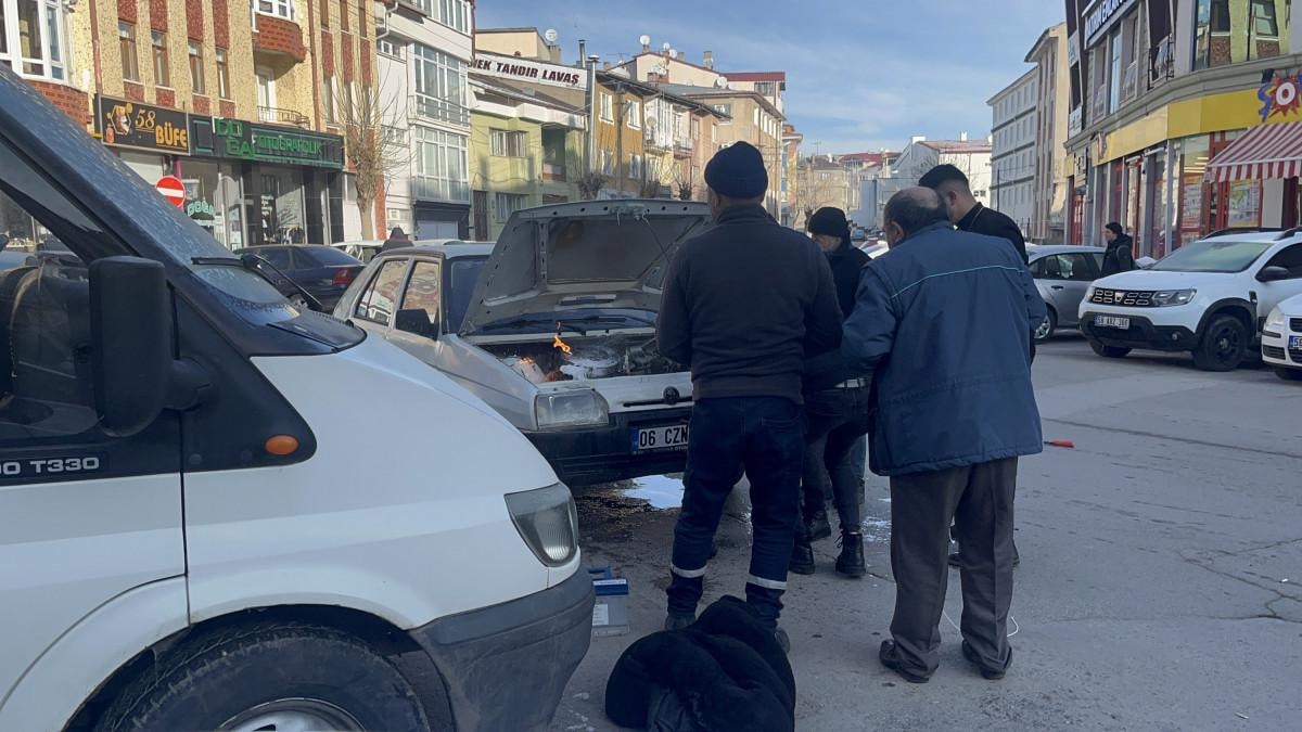Yangını söndürmek için bir şey bulamayan otomobilin sahibi, montunu çıkararak söndürmeye çalıştı.