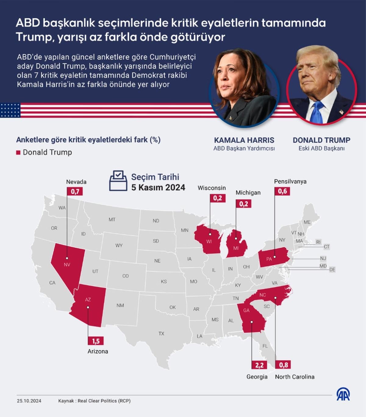 ABD'de yapılan diğer güncel anketlere göre, Harris ülke genelindeki oy oranında kıl payı Cumhuriyetçi rakibi Trump'ın önünde yarışı götürürken, Trump ise, başkanlık yarışında belirleyici olacak 7 kritik eyalette Demokrat rakibinin az farkla önünde yer alıyor.