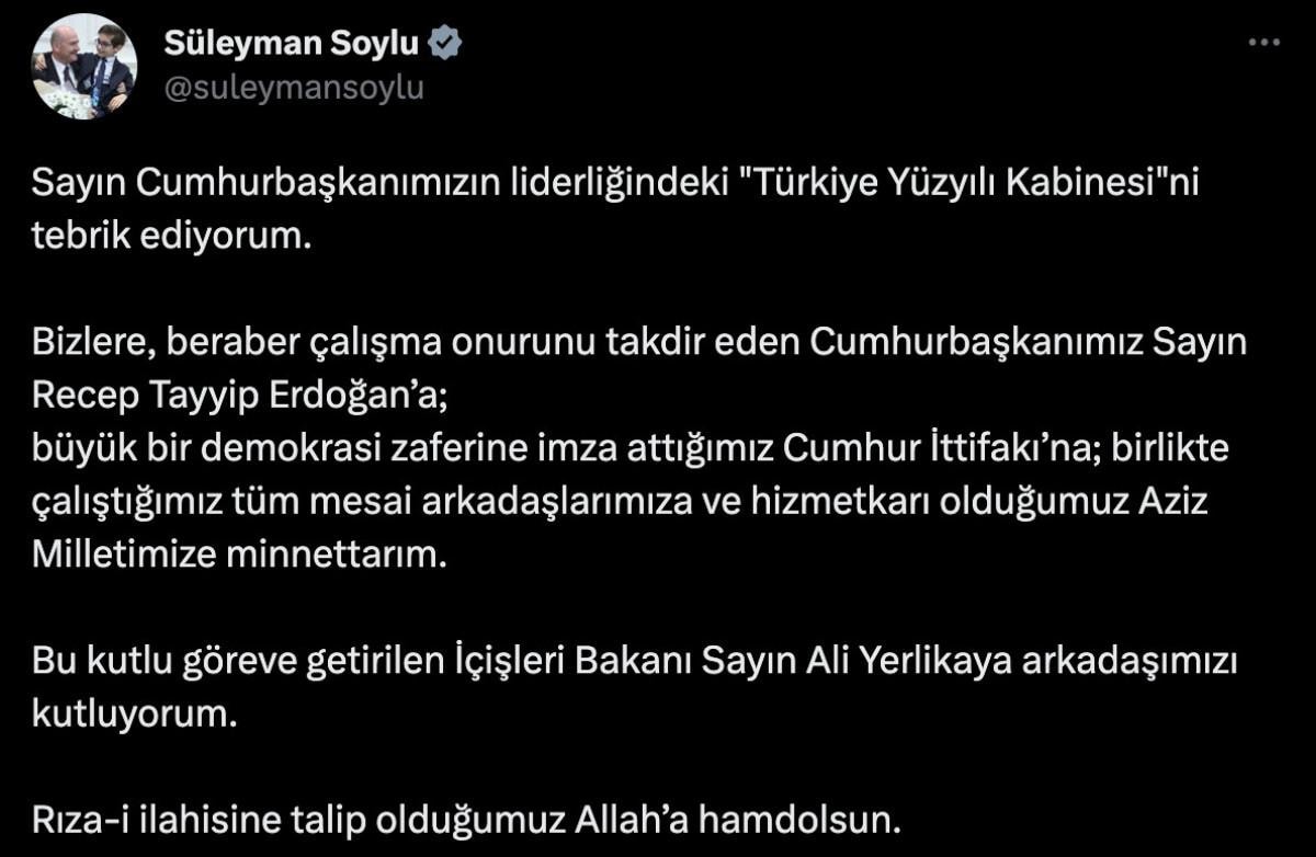 Sosyal medya hesabından bir paylaşım yapan İçişleri Bakanı Süleyman Soylu, Cumhurbaşkanlığı Kabinesi'nde yer alan isimleri kutlayarak, "Bizlere, beraber çalışma onurunu takdir eden Cumhurbaşkanımız Sayın Recep Tayyip Erdoğan'a, büyük bir demokrasi zaferine imza attığımız Cumhur İttifakı'na, birlikte çalıştığımız tüm mesai arkadaşlarımıza ve hizmetkarı olduğumuz aziz milletimize minnettarım. Bu kutlu göreve getirilen İçişleri Bakanı Sayın Ali Yerlikaya arkadaşımızı kutluyorum. Rıza-i ilahisine talip olduğumuz Allah'a hamdolsun" değerlendirmesinde bulundu.