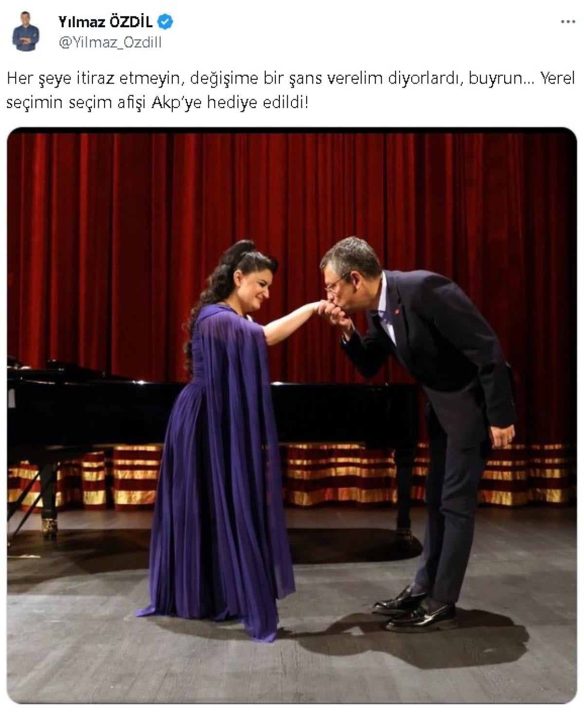 Özgür Özel, HEDEP'li Pervin Buldan'la birlikte Kadıköy'de düzenlenen 'Bir Opera Gecesi' dinletisine katılmış, Türkiye'yi 'işgalci' gören operacı Pervin Chakar'ın elini öpüp, bu anları sosyal medya hesabından paylaşmıştı.