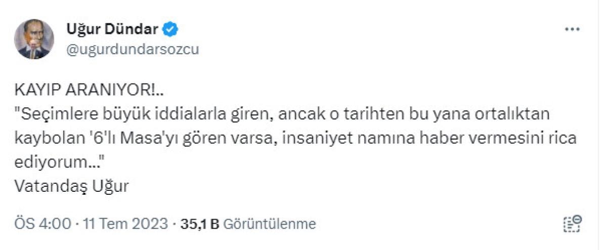 Uğur Dündar'dan 6'lı masa için kayıp ilanı