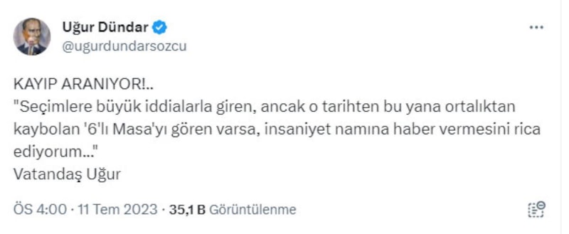 Seçimlere büyük iddialarla giren, ancak o tarihten bu yana ortalıktan kaybolan '6'lı Masa'yı gören varsa, insaniyet namına haber vermesini rica ediyorum..."