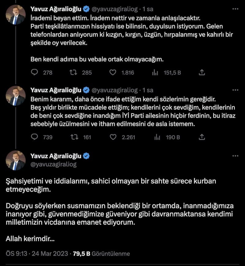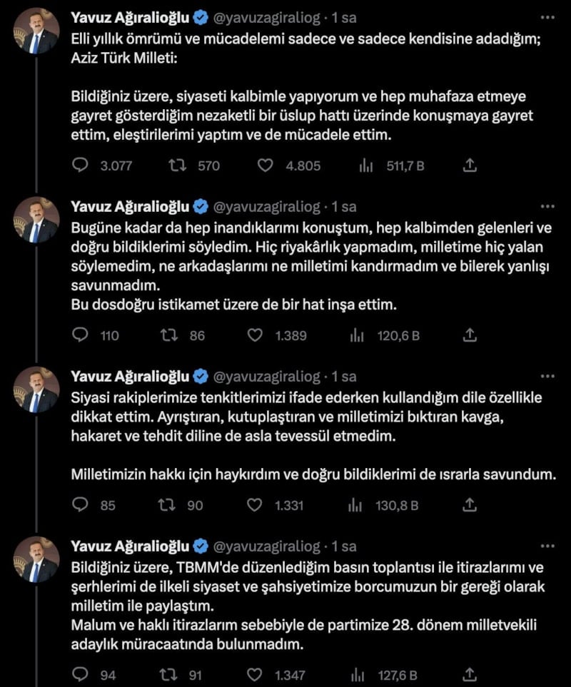 Yavuz Ağıralioğlu, son olarak sosyal medya hesabından yaptığı paylaşımda, "Malum ve haklı itirazlarım sebebiyle de partimize 28. dönem milletvekili adaylık müracaatında bulunmadım. Gelen telefonlardan anlıyorum ki kızgın, kırgın, üzgün, hırpalanmış ve kahırlı bir şekilde oy verilecek. Ben kendi adıma bu vebale ortak olmayacağım" ifadelerini kullandı.