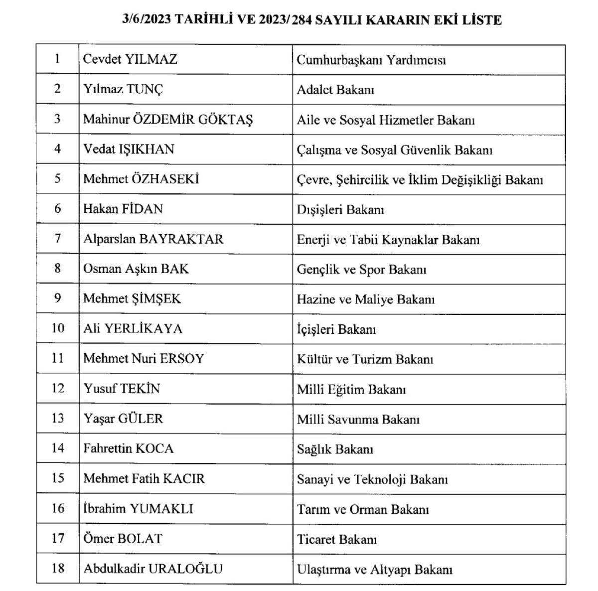 Cumhurbaşkanı Yardımcısı Cevdet Yılmaz, Adalet Bakanı Yılmaz Tunç, Aile ve Sosyal Hizmetler Bakanı Mahinur Özdemir Göktaş, Çalışma ve Sosyal Güvenlik Bakanı Vedat Işıkhan, Çevre, Şehircilik ve İklim Değişikliği Bakanı Mehmet Özhaseki, Dışişleri Bakanı Hakan Fidan, Enerji ve Tabii Kaynaklar Bakanı Alparslan Bayraktar, Gençlik ve Spor Bakanı Osman Aşkın Bak, Hazine ve Maliye Bakanı Mehmet Şimşek, İçişleri Bakanı Ali Yerlikaya, Kültür ve Turizm Bakanı Mehmet Nuri Ersoy, Milli Eğitim Bakanı Yusuf Tekin, Milli Savunma Bakanı Yaşar Güler, Sağlık Bakanı Fahrettin Koca, Sanayi ve Teknoloji Bakanı Mehmet Fatih Kacır, Tarım ve Orman Bakanı İbrahim Yumaklı, Ticaret Bakanı Ömer Bolat, Ulaştırma ve Altyapı Bakanı Abdulkadir Uraloğlu.