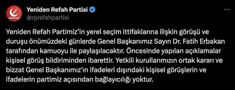 Yeniden Refah Partimizin yerel seçim ittifaklarına ilişkin görüşü ve duruşu önümüzdeki günlerde Genel Başkan'ımız Sayın Dr. Fatih Erbakan tarafından kamuoyu ile paylaşılacaktır. Öncesinde yapılan açıklamalar kişisel görüş bildiriminden ibarettir. Yetkili kurullarımızın ortak kararı ve bizzat Genel Başkan'ımızın ifadeleri dışındaki kişisel görüşlerin ve ifadelerin partimiz açısından bağlayıcılığı yoktur.