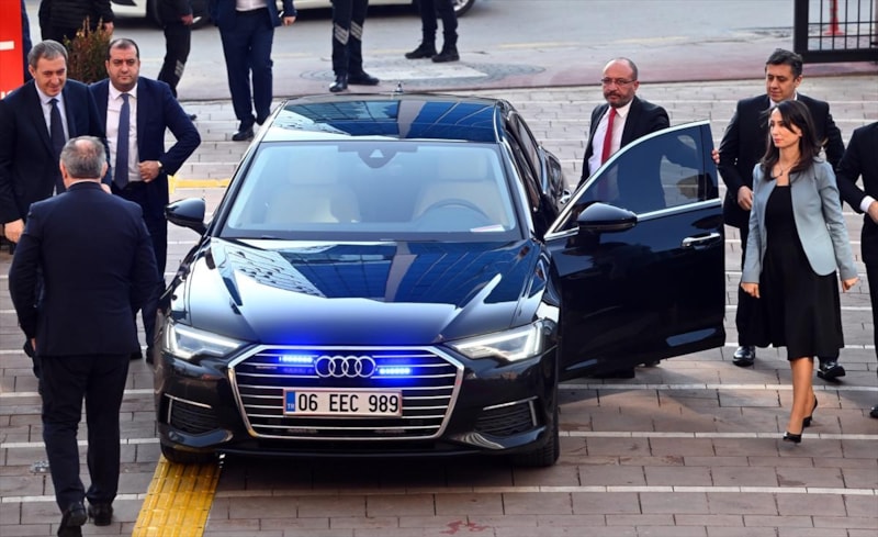 İki Eş Başkan, kırmızı halıdan geçerek binaya girdi.