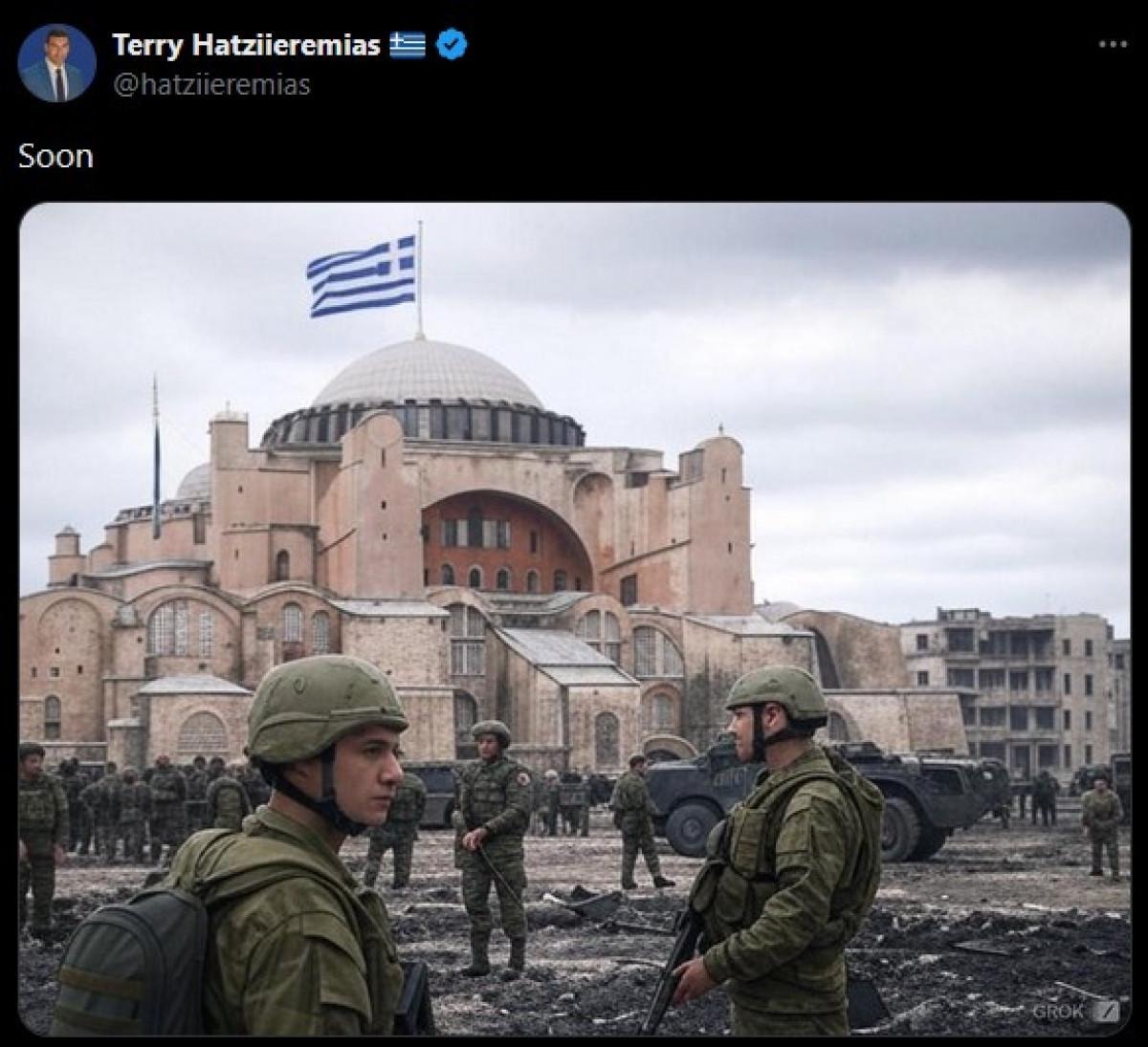 Hatziieremias, kubbesinde Yunan bayrağının yer aldığı Ayasofya Camii ve önünde İstanbul’u işgal eden Yunan askerlerinin bulunduğu, dijital olarak değiştirilmiş bir görseli yeniden “Yakında” notuyla paylaştı.
