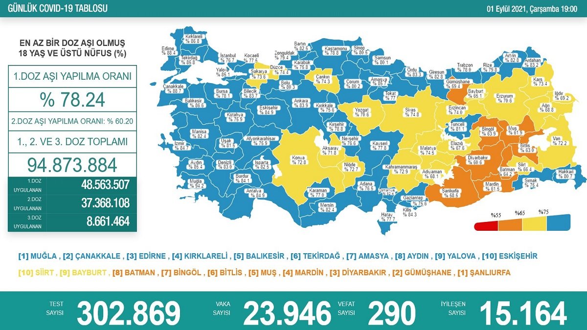 Buna göre; Türkiye'de son 24 saatte 302 bin 869 Kovid-19 testi yapıldı, 23 bin 946 kişinin testi pozitif çıktı, 290 kişi hayatını kaybetti.