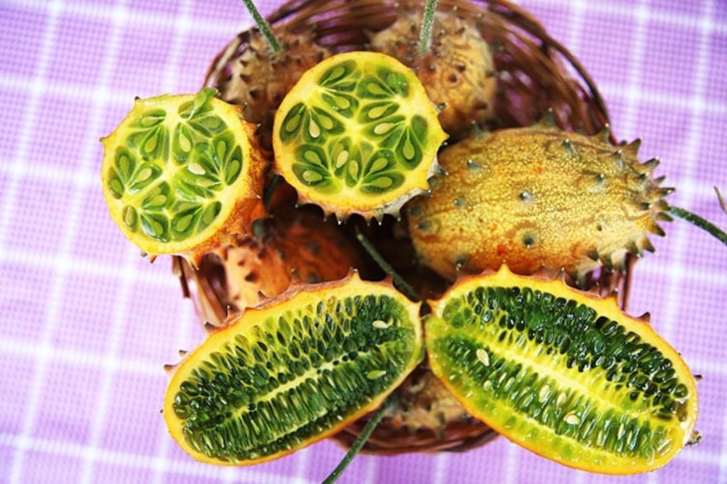 Kiwano, Afrika kökenli tropik bir meyvedir ve dış yüzeyindeki sivri çıkıntıları nedeniyle “dikenli kavun” olarak da bilinir.