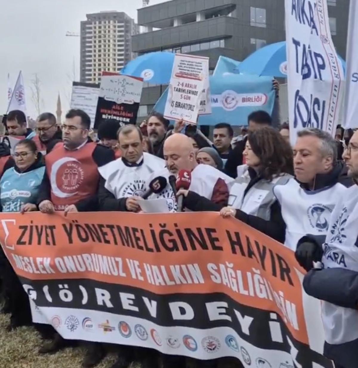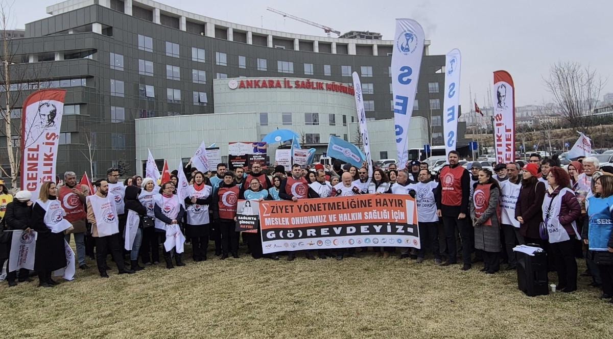 Ankara İl Sağlık Müdürlüğü önünde bir araya gelen 19 sağlık meslek örgütüne bağlı hekimler, "Eziyet yönetmeliğine hayır! Meslek onurumuz ve halkın sağlığı için g(ö)revdeyiz!" yazılı pankart ve "Bizler bu ülkenin üvey evlatları mıyız?", "Sağlıkta şiddete hayır" yazılı döviz taşıdı.