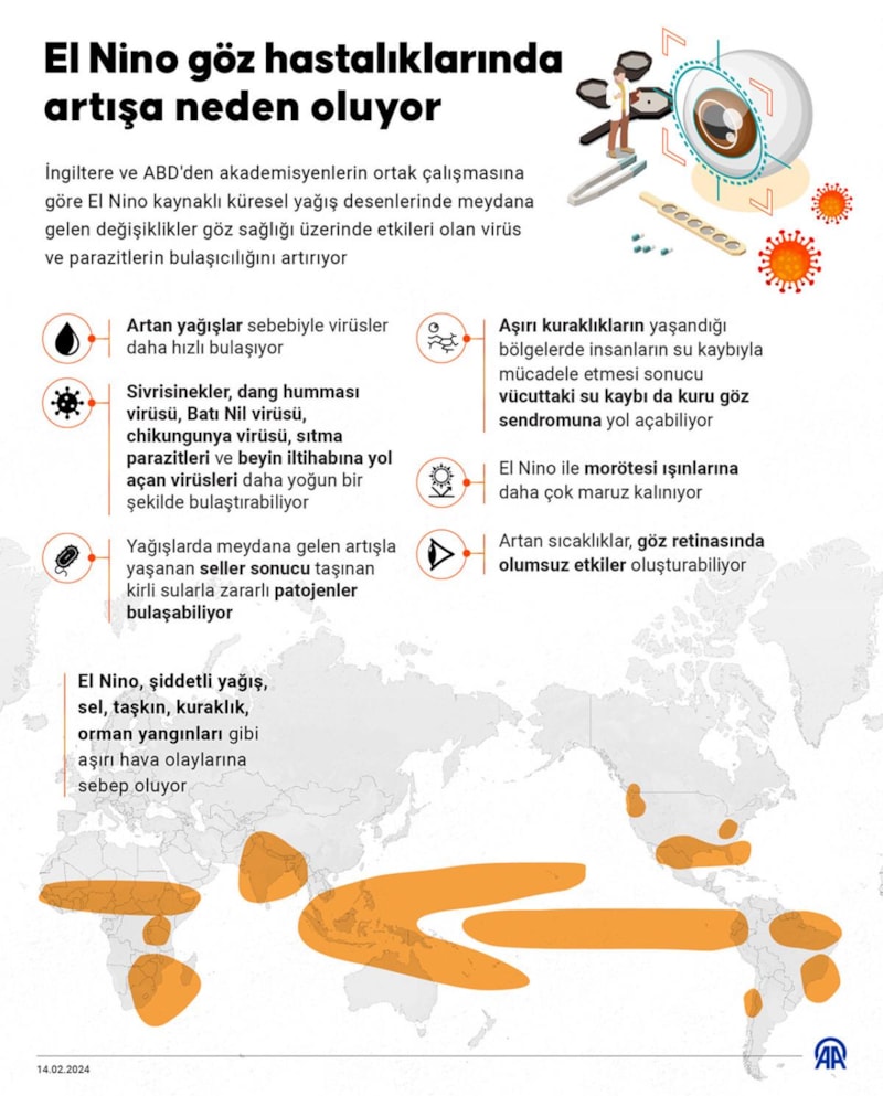 İngiltere ve ABD'den akademisyenlerin ortak çalışmasına göre El Nino kaynaklı küresel yağış desenlerinde meydana gelen değişiklikler göz sağlığı üzerinde etkileri olan virüs ve parazitlerin bulaşıcılığını artırıyor.