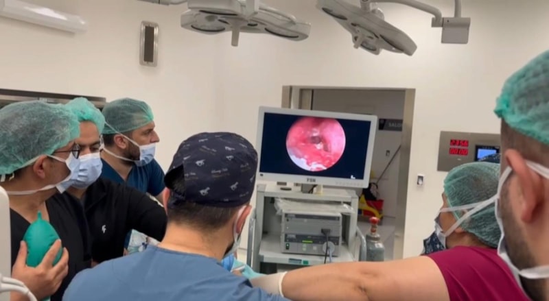 Acil serviste ciddi solunum sıkıntısı olan hasta entübe edilmiş, makineye bağlanmış. Hastaya hızlıca ameliyathanede bronkoskopi işlemi yaptık. Ana hava yollarında ve solunum yolunda yemek parçaları, ceviz parçaları vardı.