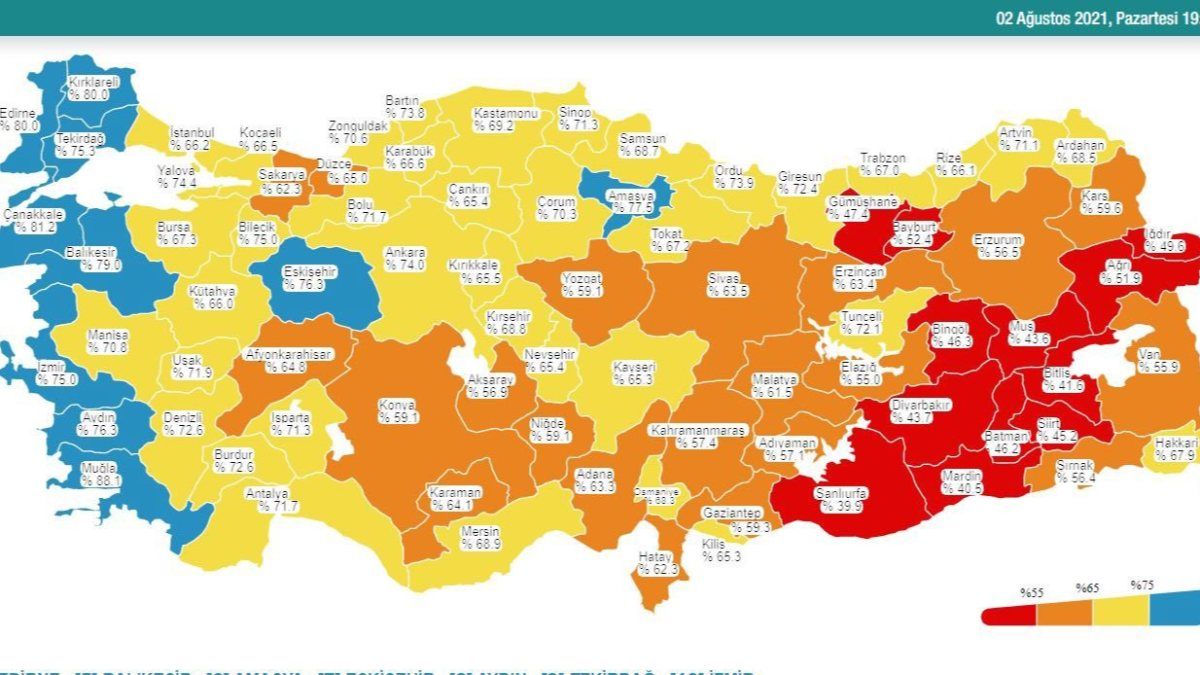 En az bir doz aşı uygulananların oranı en yüksek 10 il sırasıyla Muğla, Çanakkale, Kırklareli, Edirne, Balıkesir, Amasya, Eskişehir, Aydın, Tekirdağ ve İzmir oldu. En az bir doz aşı yapılanların oranı en az iller ise Şanlıurfa, Mardin, Bitlis, Muş, Diyarbakır, Siirt, Batman, Bingöl, Gümüşhane ve Iğdır olarak sıralandı.