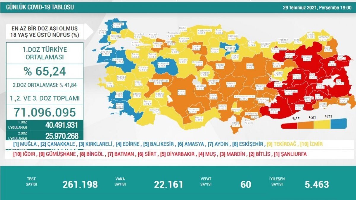 Toplamda uygulanan 1. doz aşı miktarı 40 milyon 491 bin 931 olurken, 2. doz uygulanan aşı miktarı 25 milyon 970 bin 268 oldu. Toplam uygulanan doz miktarı ise 71 milyon 96 bin 95.