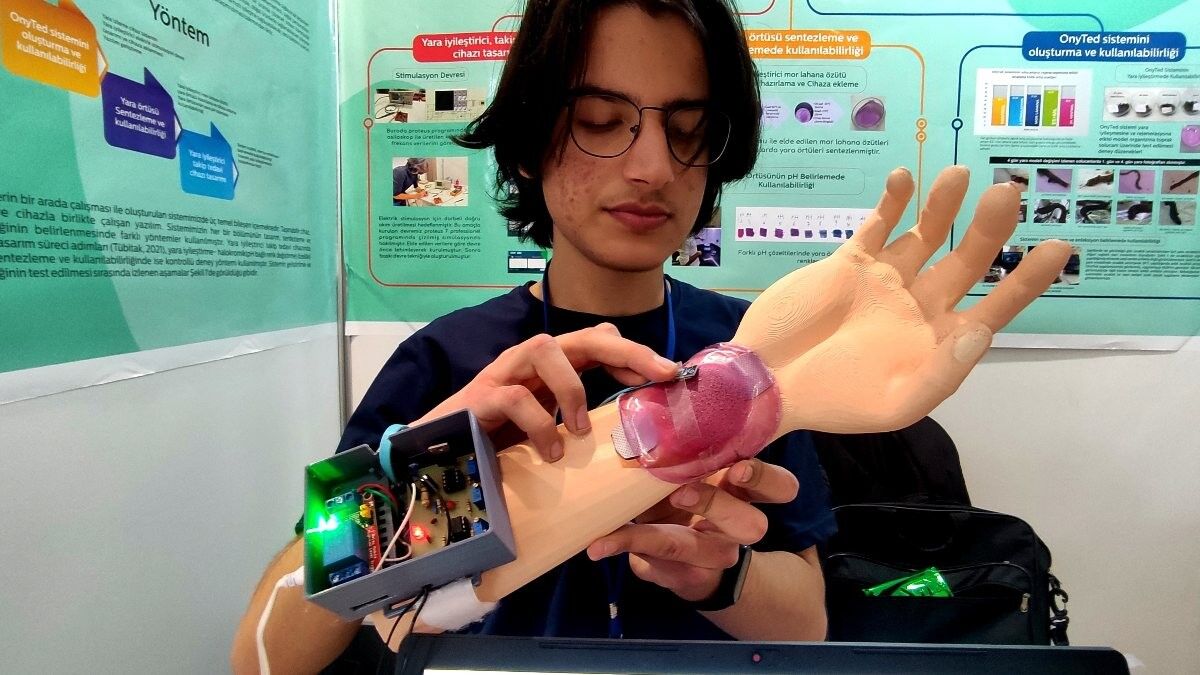 Yarışmaya katılan fen lisesi öğrencisi Raif Toprak Yıldız'ın geliştirdiği cihaz, yaraların daha hızlı iyileşmesini sağlarken yaraya yerleştirilen sensörler sayesinde yaranın enfeksiyon kapıp kapmadığını da haber veriyor.